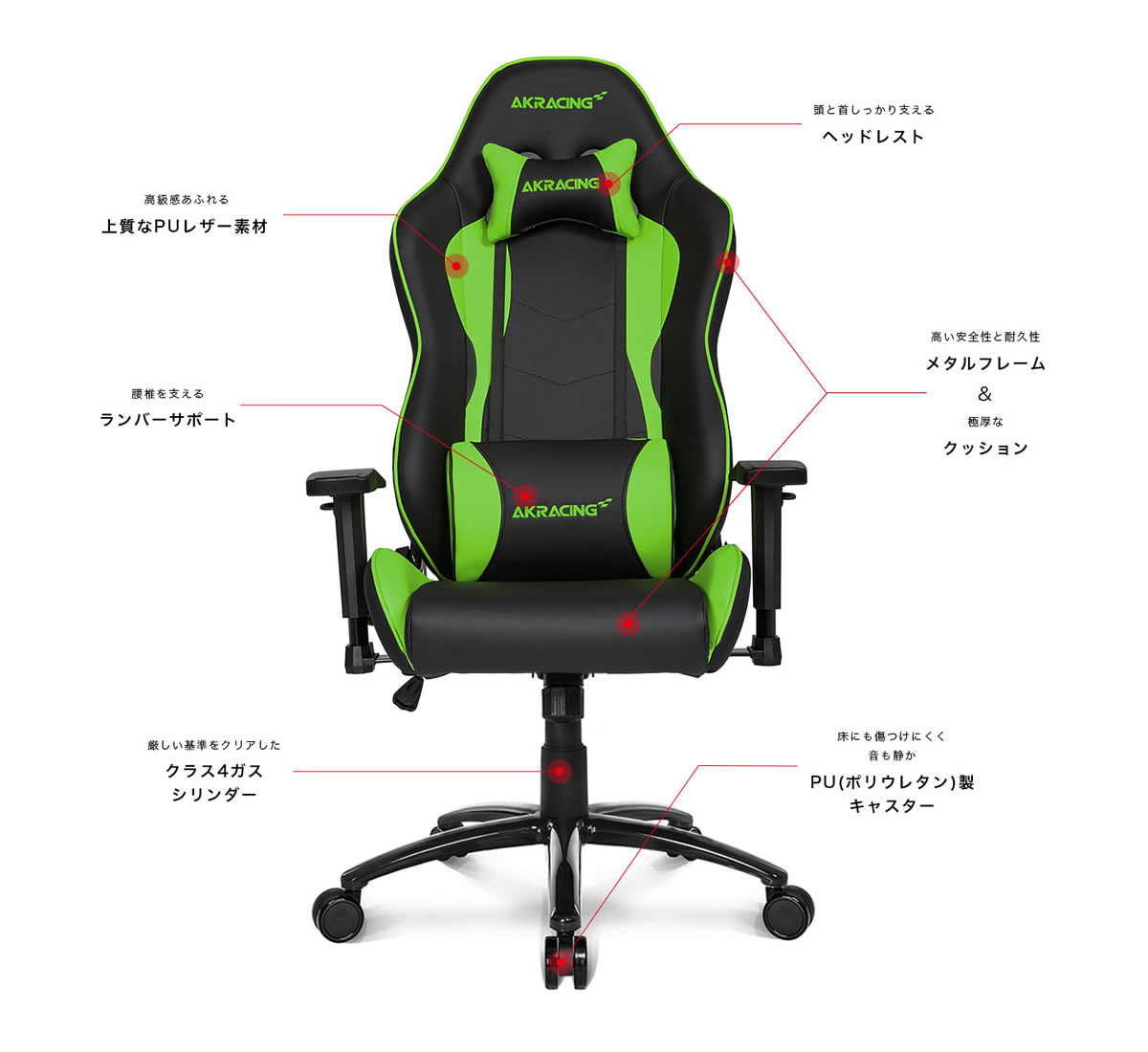 AKRacingの椅子は、その外観からわかるように、新しい発想から生まれた斬新な形状のゲームチェアです。スポーツカーのシートのような上質で柔軟な素材を使用することで、座り心地を格段にアップしました。耐久性がある堅牢なメタル構造により、長くご使用いただくことができます。