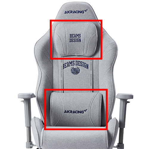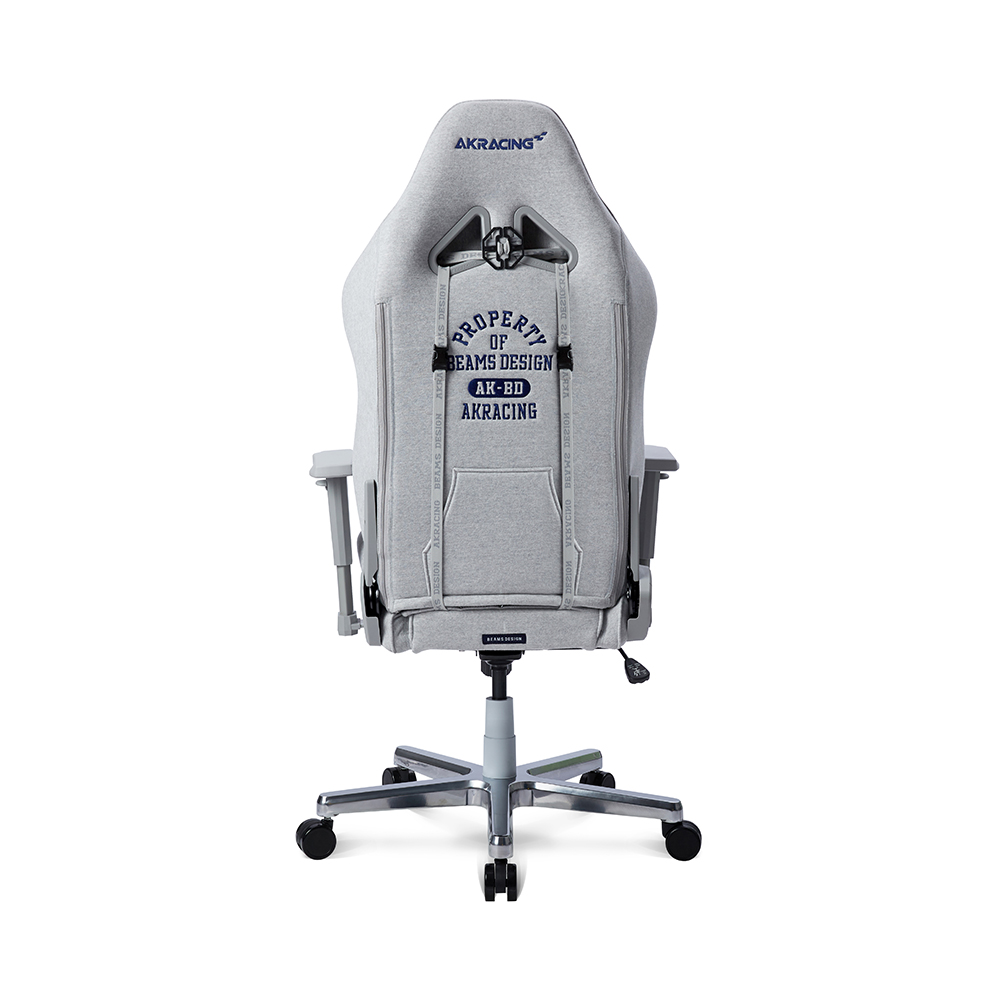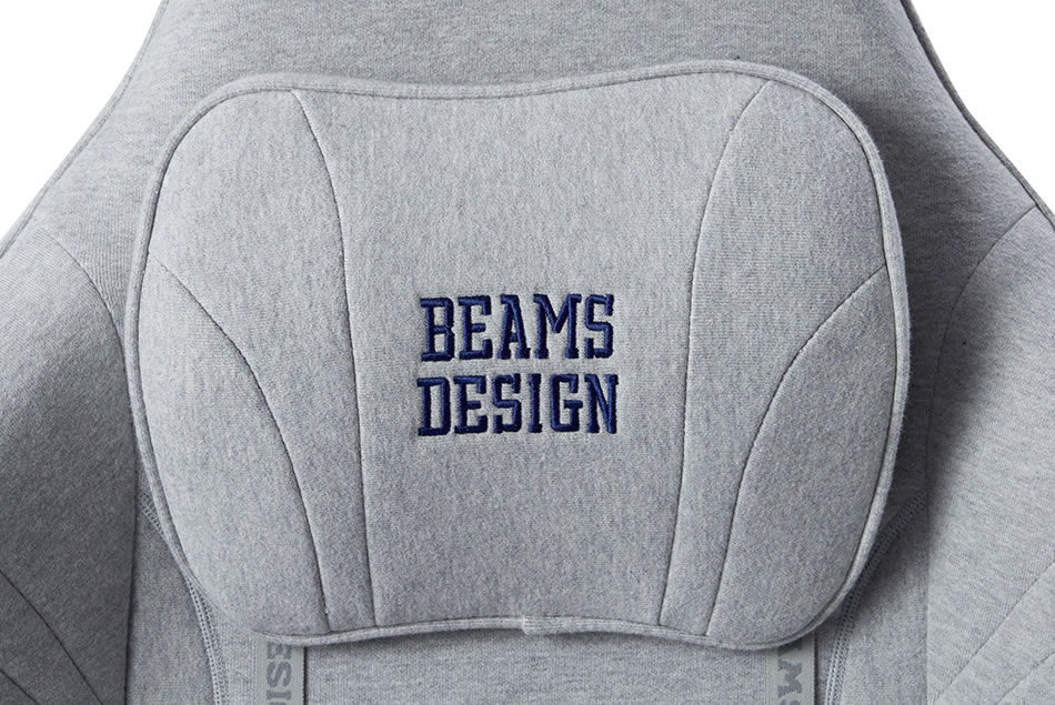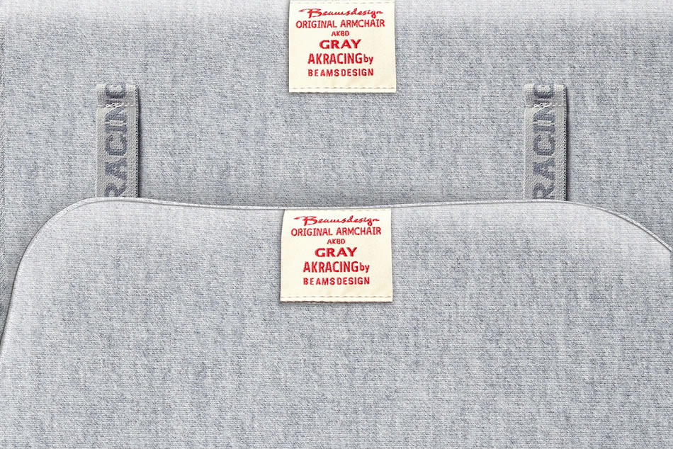 背もたれ中央部にはエンブレム、背面にはヴィンテージスウェットでは希少とされている”4段プリント”を刺繍で表現。更にスウェットならではのディテールとして背面にはカンガルーポケットを配し遊び心もプラス。”AKRacing by BEAMS DESIGN”のオリジナルネームタグも制作し、カンガルーポケット内側やヘッドレスト・ランバーサポートの裏側など、実際のカレッジスウェットかのようなコレクター心をくすぐる表現を細かくあしらっています。