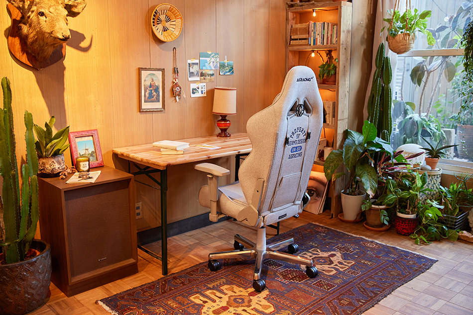 デザイン面だけではなく、座り心地にも妥協はありません。張地にセレクトしたのはニット生地の産地として名高い大阪・泉州地域で編み立てられたコットン100%のスウェット生地です。ヴィンテージスウェットライクな風合いを表現しつつも絶妙な度詰め感で肌当たりは柔らかく、AKRacing独自の人間工学設計によるクッション材と合わせて快適な座り心地を実現します。スウェット生地は適度な吸湿性と通気性を兼ね備えているため、季節を問わず気持ち良い肌触りを楽しむことができます。