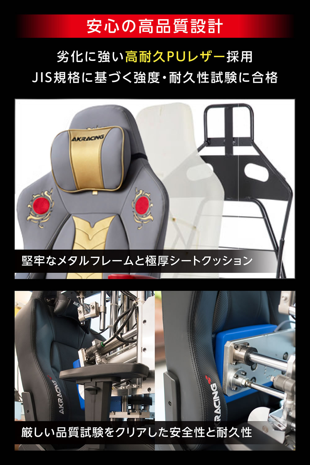 AKRacingでは自社工場・自社生産にこだわり、チェア基幹部品のサプライヤーも関連会社化することで一貫した生産管理を行い、品質の向上と安定に努めています。