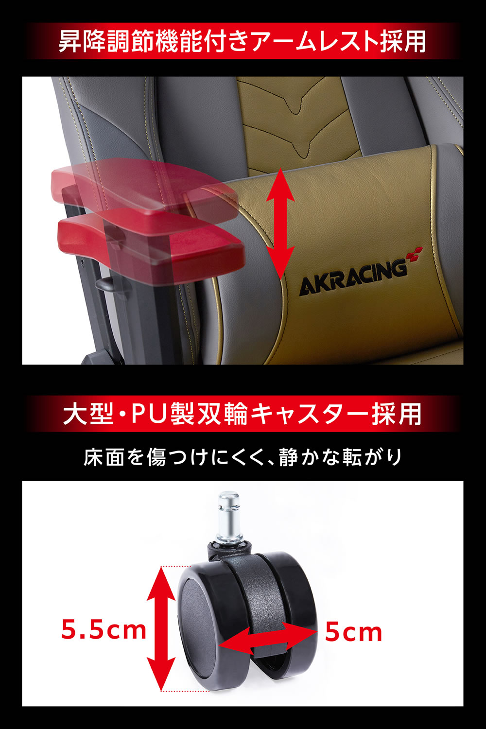 AKRacingのオフィス向けモデルとして定評あるPremiumシリーズをベースとしていますので、上記のように印象的な外観の中にもチェアとしての基本性能を確保しています。体圧を分散する構造のクッション材、フルフラットリクライニング機能、ロッキング機能、昇降式アームレストといったAKRacingチェアの代表的な各種機能を搭載しており、デスクワーク、ゲーミング、エンターテインメントいずれの用途でも快適にお使いいただくことが可能です。