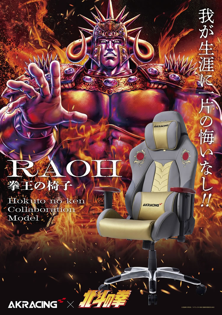 中でも、世紀末覇者拳王を名乗り世界制圧を目論むも最後には愛と哀しみを知った北斗4兄弟の長兄”ラオウ”は、多くのファンを獲得しています。AKRacingではこの”ラオウ”をイメージとしたスペシャルデザインチェアを発売いたします。