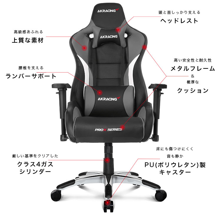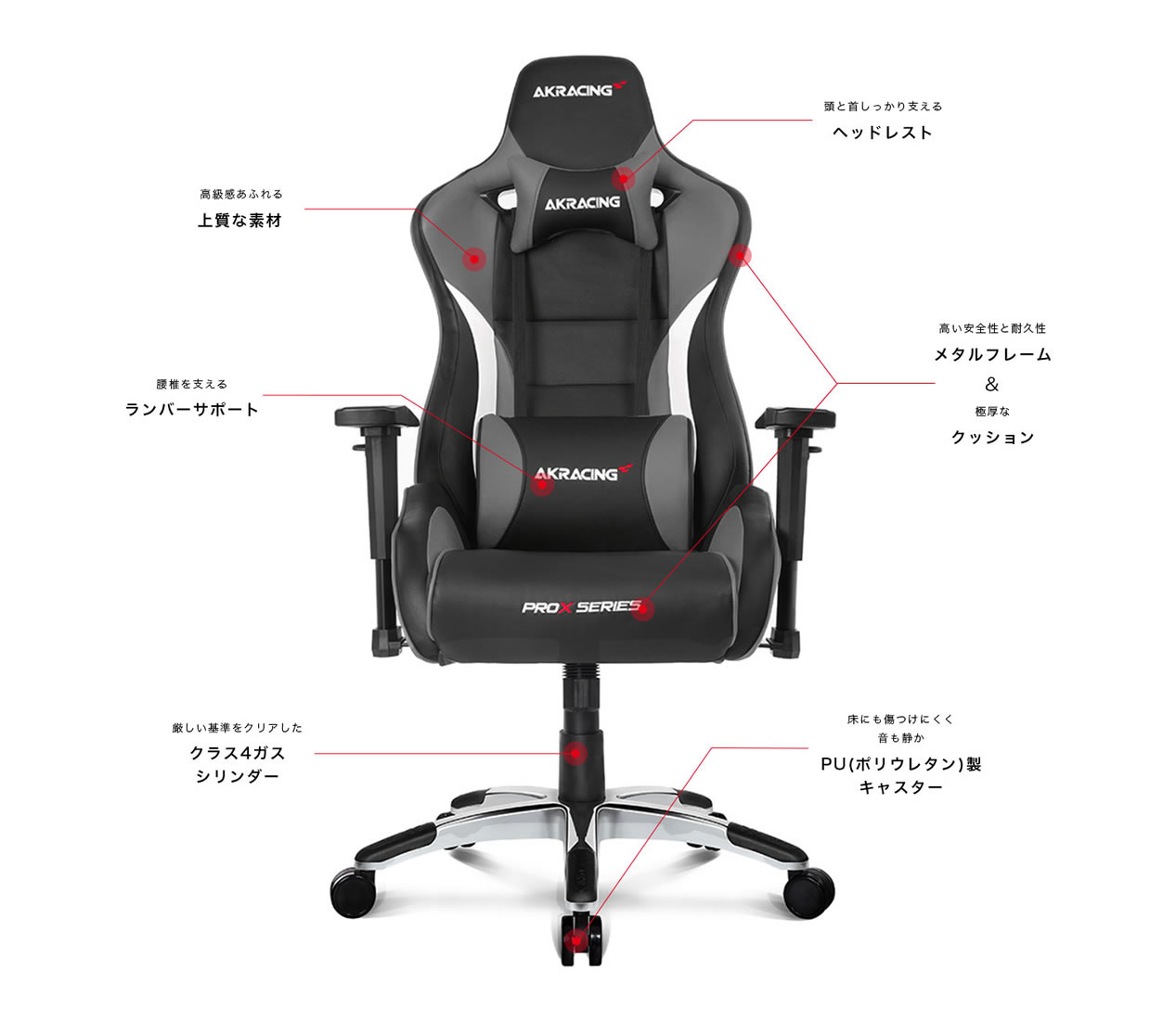 長時間のゲームプレイやPC作業において疲労の軽減と集中力の持続を支援する、エルゴノミクス(人間工学)設計のAKRacingゲーミングチェア製品のハイエンドモデルとなる製品です。内部メタルフレームの再設計により、横幅550mm,背もたれ部の高さ950mmとなり、よりゆったりとした座り心地をもたらします。シート部分・バックレスト部分の内部には、全体に亘って専用設計のウレタンフォームをふんだんに使用し、耐圧を分散させる構造により身体への無理な負荷を減らし、疲労を軽減する効果をもたらします。